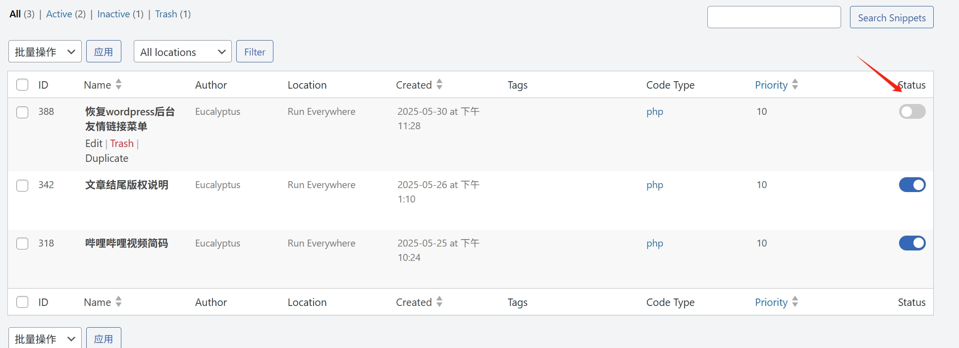 这时你可以在后台的WPCode插件中找到刚刚添加并导致错误的代码片段,直接删除或禁用,以恢复正常运行。