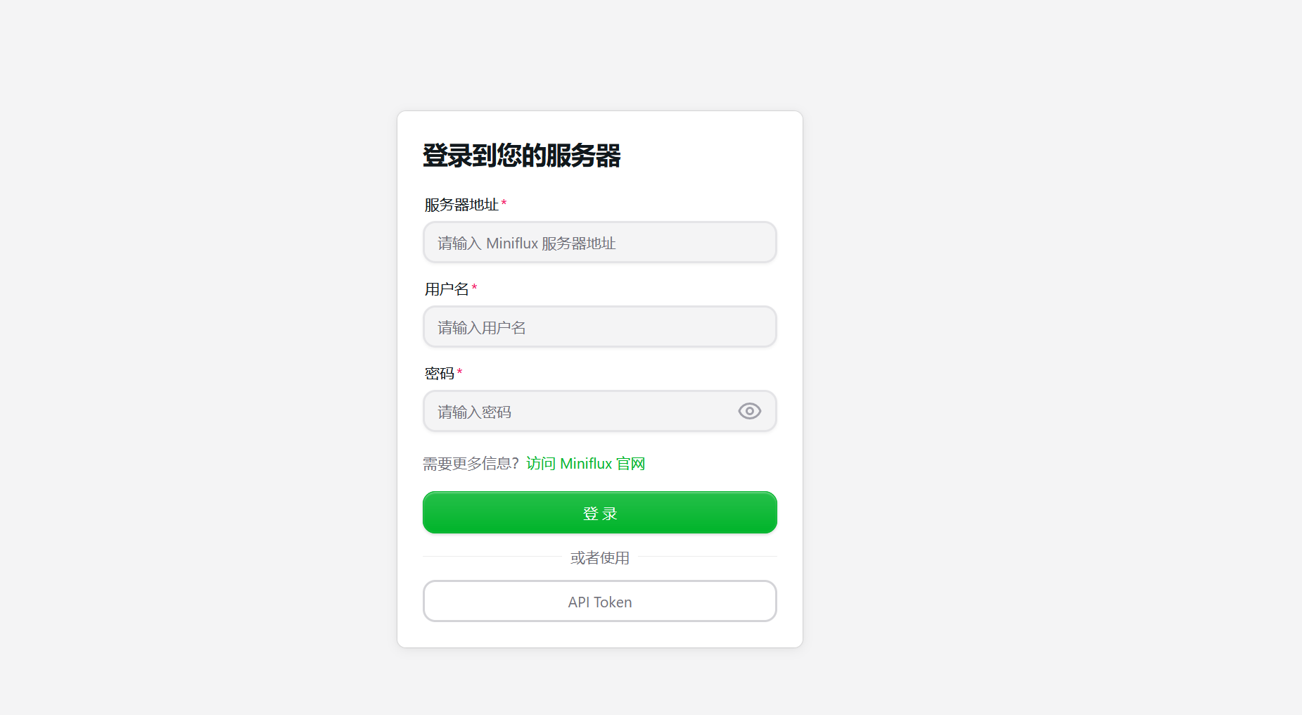 到这里基本上就可以看到Nextflux的登录界面了,我们可以看到这里除了用户名和密码外,还有个服务地址,这个服务地址就是Miniflux的访问地址,但是有几点需要注意
