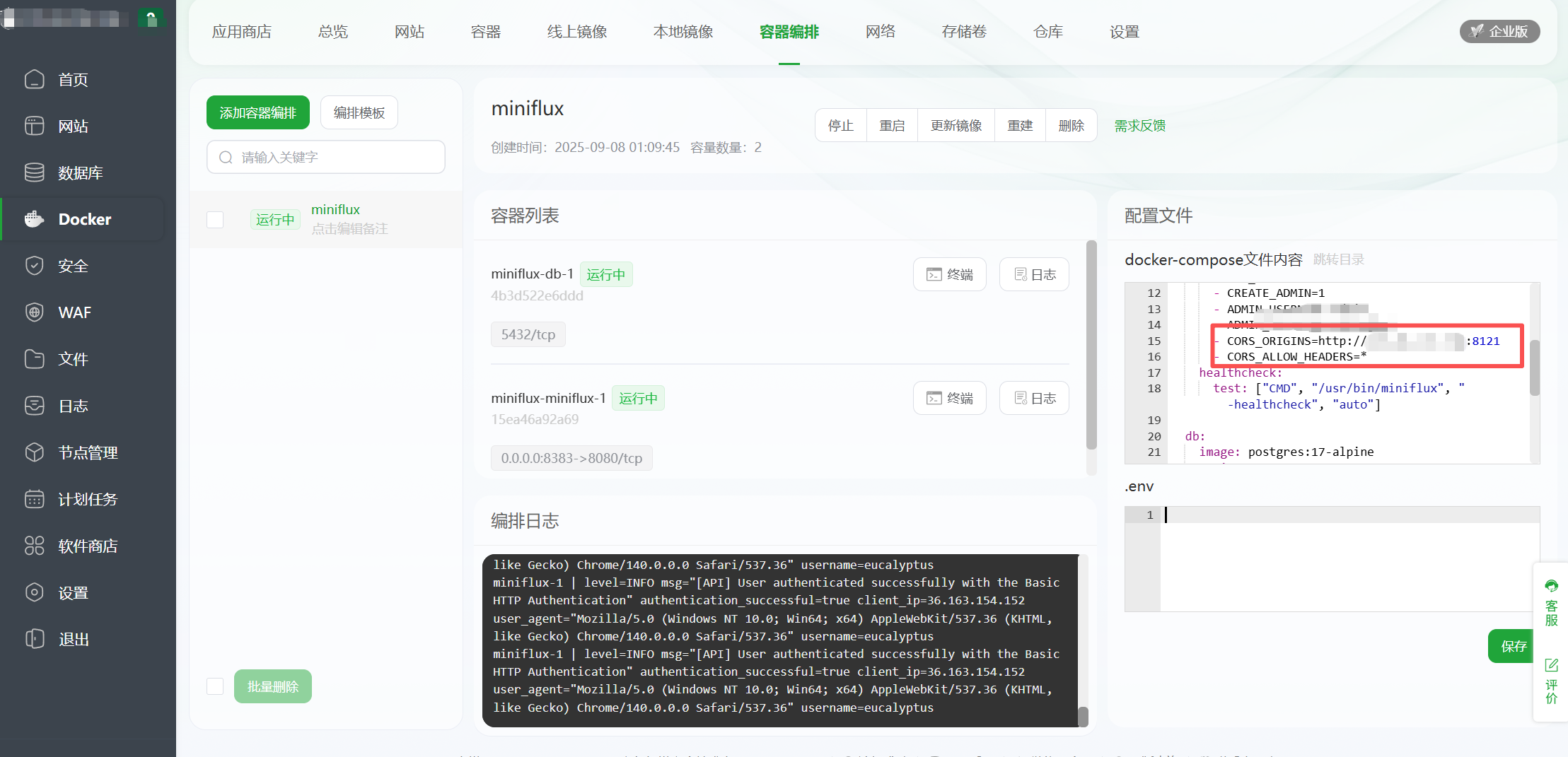 这里我建议直接使用宝塔面板的可视化操作界面进行操作,这样不仅能显著提高操作容错率,还能避免因手动输入命令导致的潜在错误;关于yml配置文件,我们可以直接复用之前部署Miniflux时使用的模板文件,只需在数据库配置部分额外添加这两个关键环境变量即可,完成这些修改后,直接保存配置文件即可生效,此时我们再次通过IP地址访问服务并进行登录操作,整个过程就会变得非常顺畅,不会再出现之前遇到的连接或认证问题,这种方案既保留了原有配置的稳定性,又通过最小改动实现了新功能的支持。